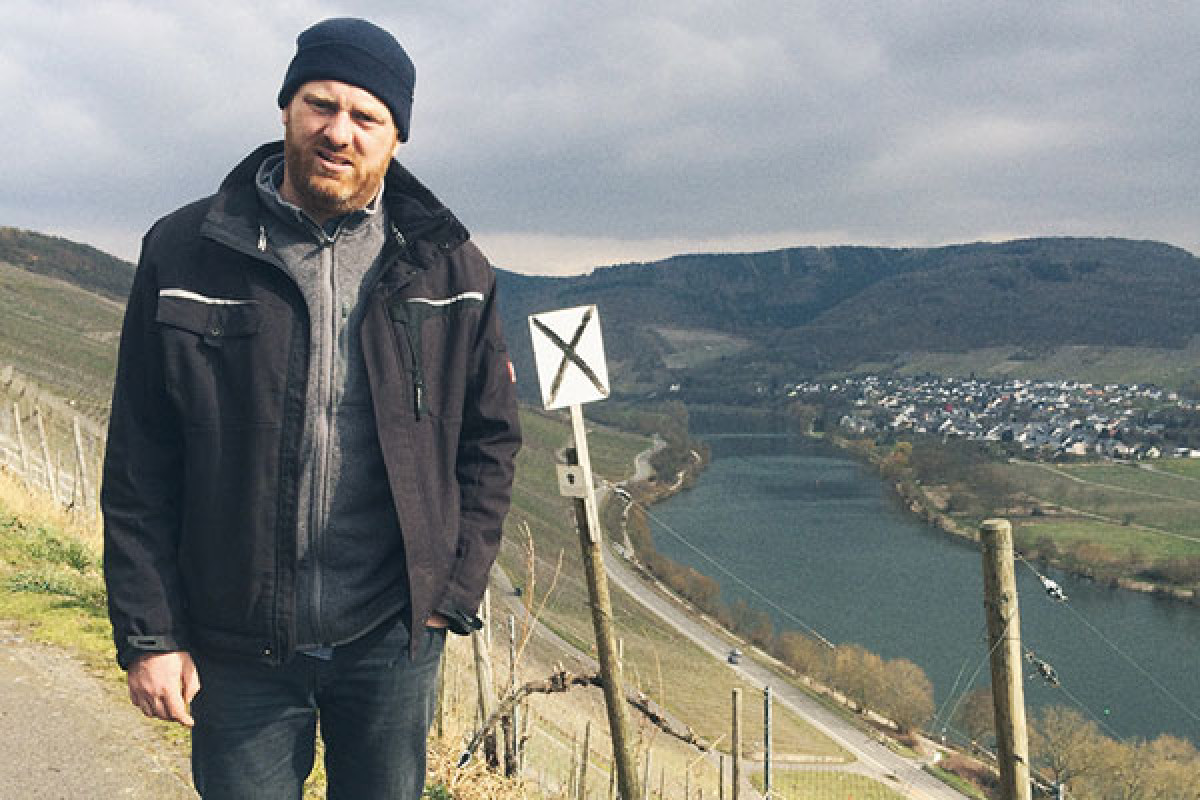 Axels Lagen sind spektakulär. Seine besten liegen im Lieser Niederberg-Helden. Dort ist es so steil, dass es einem Ungeübten schon mal schwindelig werden kann. Es erklärt sich von selbst, dass die Bewirtschaftung dieser Schieferlagen äusserst beschwerlich ist. Axel trägt auch das mit Humor. Sein Motto: „Steillagenwinzer, man könnte es einfach haben aber nicht schöner.“ Im Niederberg sind ihm die hoch gelegenen Parzellen am liebsten. Nah am Wald, der im Sommer für Kühlung sorgt, ist es für ihn einfacher, keine allzu hohen Mostgewichte einzufahren.